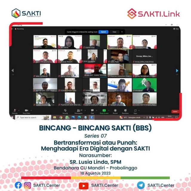Webinar Bincang-Bincang SAKTI 07 diselenggarakan oleh SAKTI pada tanggal 18 Agustus 2023 dengan tema "Bertransformasi atau Punah: Menghadapi Era Digital dengan SAKTI" bersama narasumber inspiratif yaitu Sr. Lusia Linda, SPM selaku Bendahara Pengurus di CU Mandiri – Probolinggo.